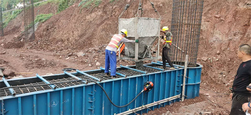 巖板田大橋(左幅)下部結(jié)構(gòu)是該項目的控制性工程,為樁基礎(chǔ)+地系梁+墩柱+蓋梁結(jié)構(gòu),此次澆筑的首根地系梁是5#地系梁。由于地質(zhì)情況復(fù)雜多變、河水深,且右線既有道路邊坡山體陡峭,需要在雨季前完成下部結(jié)構(gòu)樁基、地系梁、墩柱的施工,工期緊、任務(wù)重,組織協(xié)調(diào)難度大。