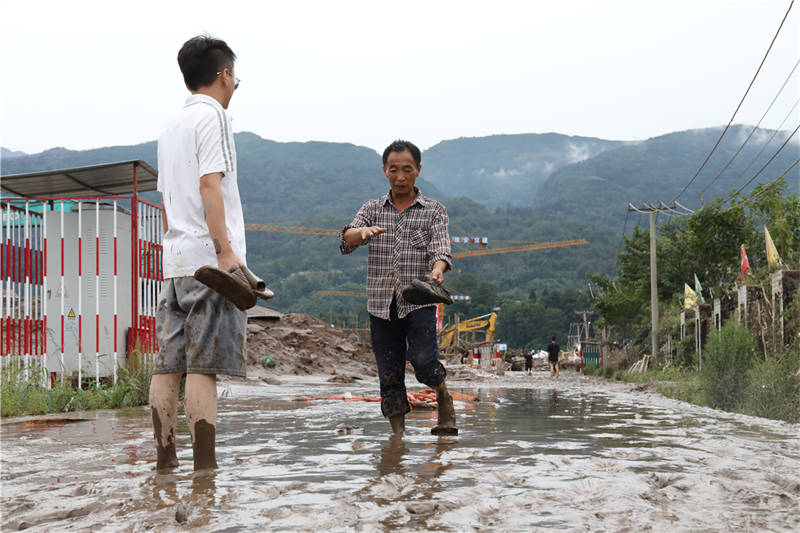 8月18日下午,在草壩青衣江大橋建設現(xiàn)場,項目部外的院壩、工地附近的道路,均覆蓋著厚厚的淤泥!白蛲砭o急撤離,我的車停在河邊,也沒來得及開走,現(xiàn)在都沒找到!币荒樒v的李勁松告訴記者,雖然洪水漲勢迅猛,但他們撤離之前,提前通知了電力部門斷電,否則若有人再次靠近洪水,將面臨觸電的風險。