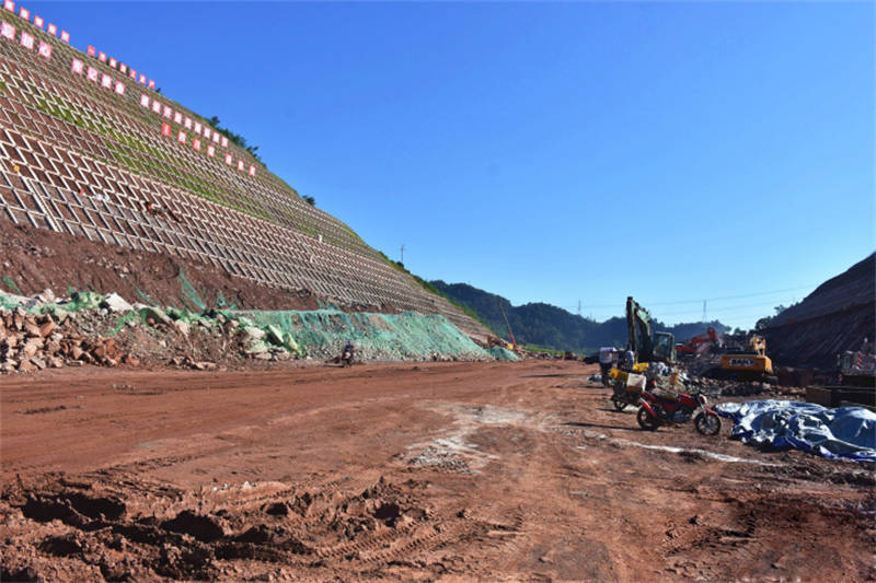 在金雞關(guān)開挖現(xiàn)場,貨車往來運輸著物料,挖掘機、吊車等各司其職,在機械和車輛碾壓下,土路基已較為平坦,道路初具雛形。