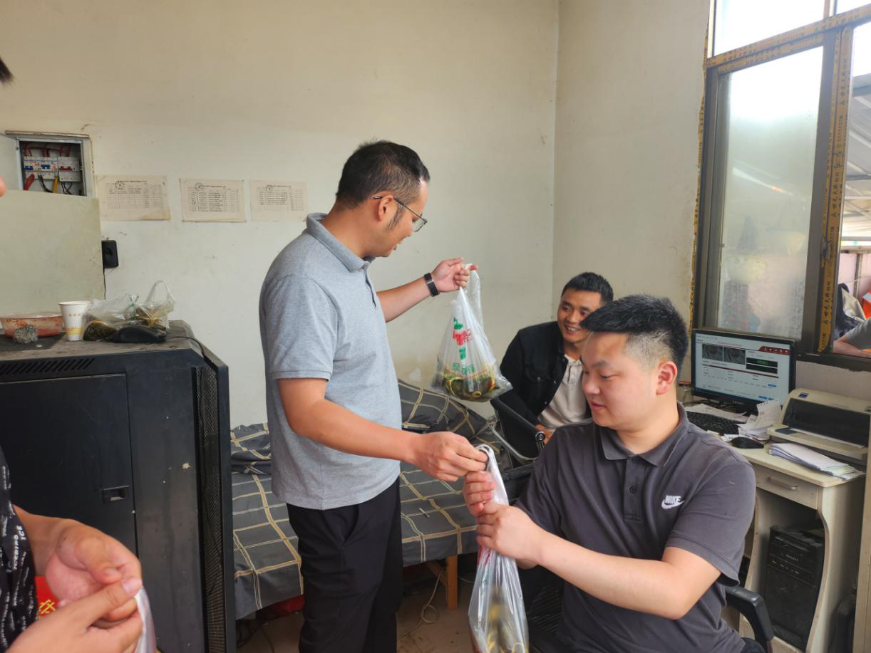 公司食堂內(nèi),歡聲笑語一片!大家通力合作,在廚房阿姨的教學(xué)下包出一個個清香軟糯的愛心粽子,一起品嘗分享,整個活動過程洋溢著祥和歡快的節(jié)日氛圍。為讓堅(jiān)守在代碑寺項(xiàng)目一線崗位的員工感受到組織的溫暖,隨后,公司總經(jīng)理張忠強(qiáng)帶隊(duì)奔赴代碑寺項(xiàng)目一線崗位,將包好的粽子送到員工手中,并送去節(jié)日的祝福。