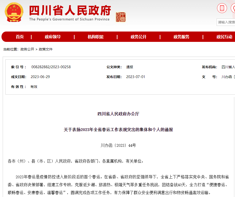 近日,四川省人民政府辦公廳印發(fā)《關(guān)于表?yè)P(yáng)2023年全省春運(yùn)工作表現(xiàn)突出的集體和個(gè)人的通報(bào)》,四川蜀通運(yùn)業(yè)有限公司榮獲 “2023年全省春運(yùn)工作表現(xiàn)突出集體”稱(chēng)號(hào)。