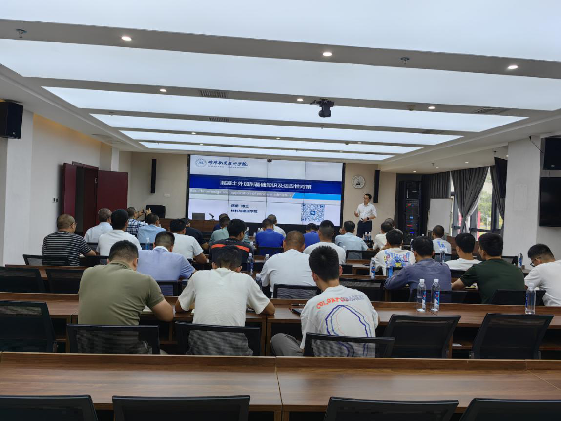 培訓(xùn)邀請綿陽職業(yè)技術(shù)學(xué)院材料與建造學(xué)院院長賈陸軍、蔣勇兩位博士授課,重點圍繞配合比設(shè)計中需注意的事項展開,詳細(xì)講解配合比設(shè)計要點,分析原材料選擇及礦粉、粉煤灰摻合料摻配比例的重要性,總結(jié)交流機(jī)制砂在混凝土中的應(yīng)用技術(shù),講解混凝土外加劑基礎(chǔ)知識、分析目前外加劑在使用過程中適應(yīng)性問題和原因,通過真實案例分析混凝土質(zhì)量問題的原因及管控要點等。