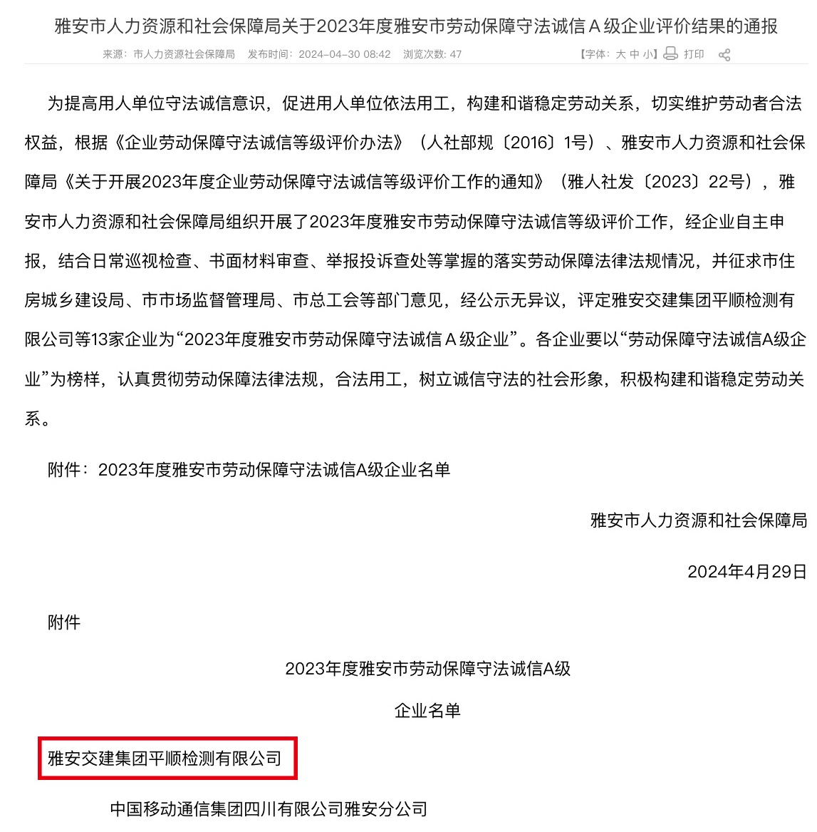近日,雅安市人社局發(fā)布通報(bào),雅安交建集團(tuán)平順公司被評(píng)定為“2023年度雅安市勞動(dòng)保障守法誠(chéng)信A級(jí)企業(yè)”。此次評(píng)選由人社局結(jié)合日常巡視檢查、書面材料審查、舉報(bào)投訴查處以及專項(xiàng)檢查等活動(dòng)掌握的落實(shí)勞動(dòng)保障法律法規(guī)情況,并征求市場(chǎng)監(jiān)管局等部門和單位意見后,綜合評(píng)定而出。
