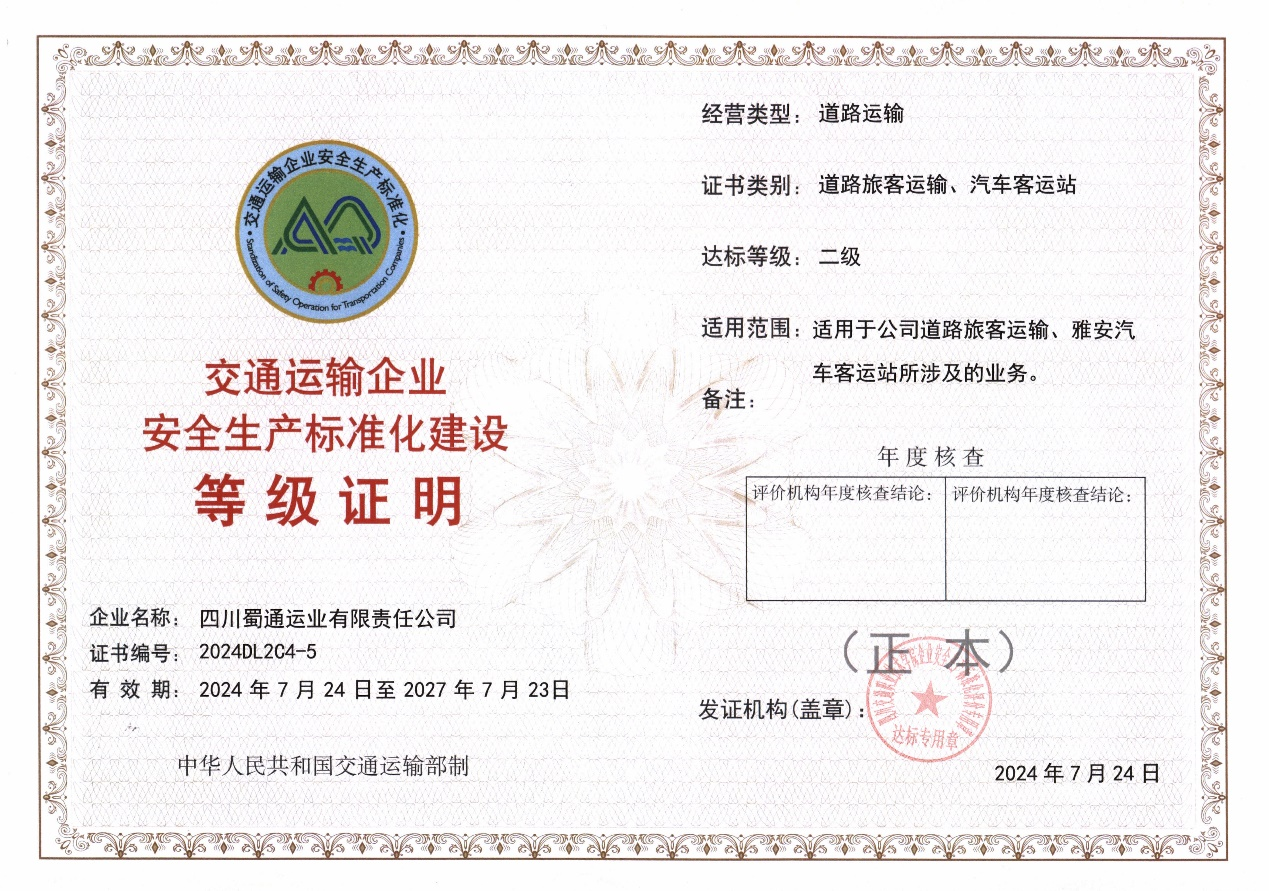 近日,經(jīng)四川省交通運(yùn)輸企業(yè)安全生產(chǎn)標(biāo)準(zhǔn)化評(píng)價(jià)機(jī)構(gòu)綜合評(píng)定,雅安交建集團(tuán)蜀通公司順利通過(guò)安全標(biāo)準(zhǔn)化二級(jí)企業(yè)驗(yàn)收并獲得等級(jí)證書(shū),標(biāo)志著公司安全管理工作更趨于標(biāo)準(zhǔn)化,安全管理水平邁上了新臺(tái)階。