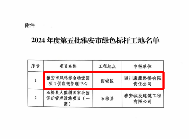 近日,由雅安交建集團(tuán)康藏路橋公司建設(shè)的鳳鳴綜合物流園項(xiàng)目供應(yīng)鏈管理中心,經(jīng)市住建局、市生態(tài)環(huán)境局、市城管執(zhí)法局聯(lián)合評(píng)審小組綜合考評(píng),被評(píng)為雅安市綠色標(biāo)桿工地。