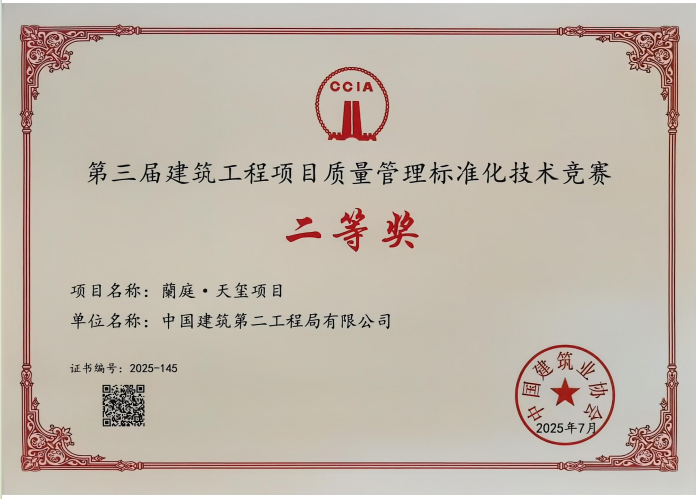 近日,交建開發(fā)公司旗下“蘭庭・天璽”項(xiàng)目在中國建筑業(yè)協(xié)會組織的“第三屆建筑工程項(xiàng)目質(zhì)量管理標(biāo)準(zhǔn)化技術(shù)競賽”中榮獲二等獎。此次獲獎,標(biāo)志著“蘭庭・天璽”項(xiàng)目的質(zhì)量管理體系與工程實(shí)體質(zhì)量獲得了行業(yè)權(quán)威認(rèn)可,為項(xiàng)目后續(xù)創(chuàng)建更高層次的品質(zhì)獎項(xiàng)積累了寶貴經(jīng)驗(yàn)。