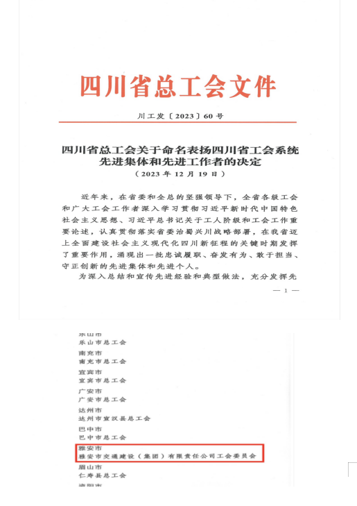 12月19日,四川省總工會(huì)將雅安市交通建設(shè)(集團(tuán))有限責(zé)任公司工會(huì)委員會(huì)命名表?yè)P(yáng)為“四川省工會(huì)系統(tǒng)先進(jìn)集體”。