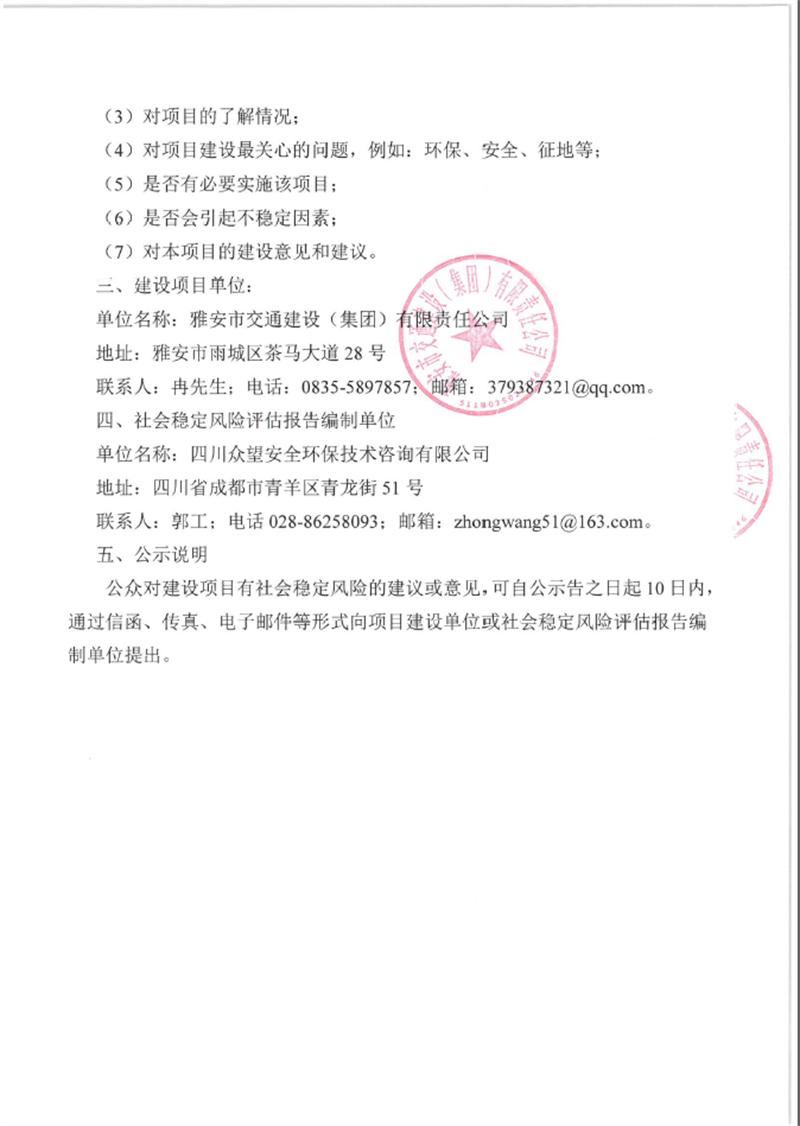 成雅高速金雞關(guān)互通及服務(wù)區(qū)項(xiàng)目(雨名快速通道)社會(huì)穩(wěn)定風(fēng)險(xiǎn)評估公眾參與公示