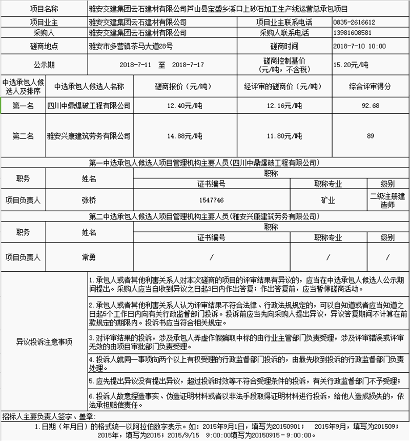 雅安交建集團云石建材有限公司蘆山縣寶盛鄉(xiāng)溪口上砂石加工生產線運營總承包項目中選承包人公示