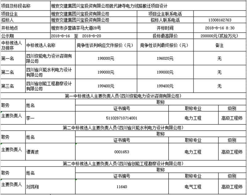 雅安交建集團(tuán)興寶投資有限公司就代碑寺電力線路搬遷項(xiàng)目設(shè)計(jì)競爭性談判中標(biāo)候選人公示