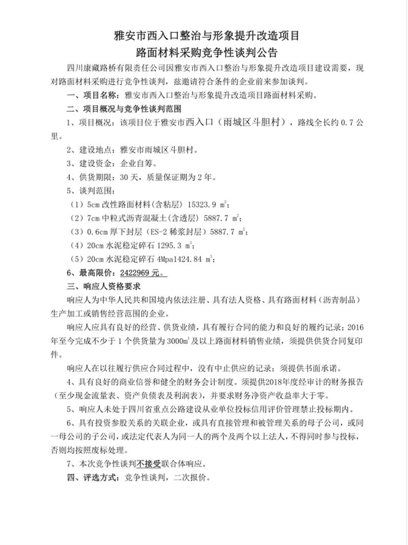 雅安市西入口整治與形象提升改造項(xiàng)目路面材料采購競(jìng)爭(zhēng)性談判公告