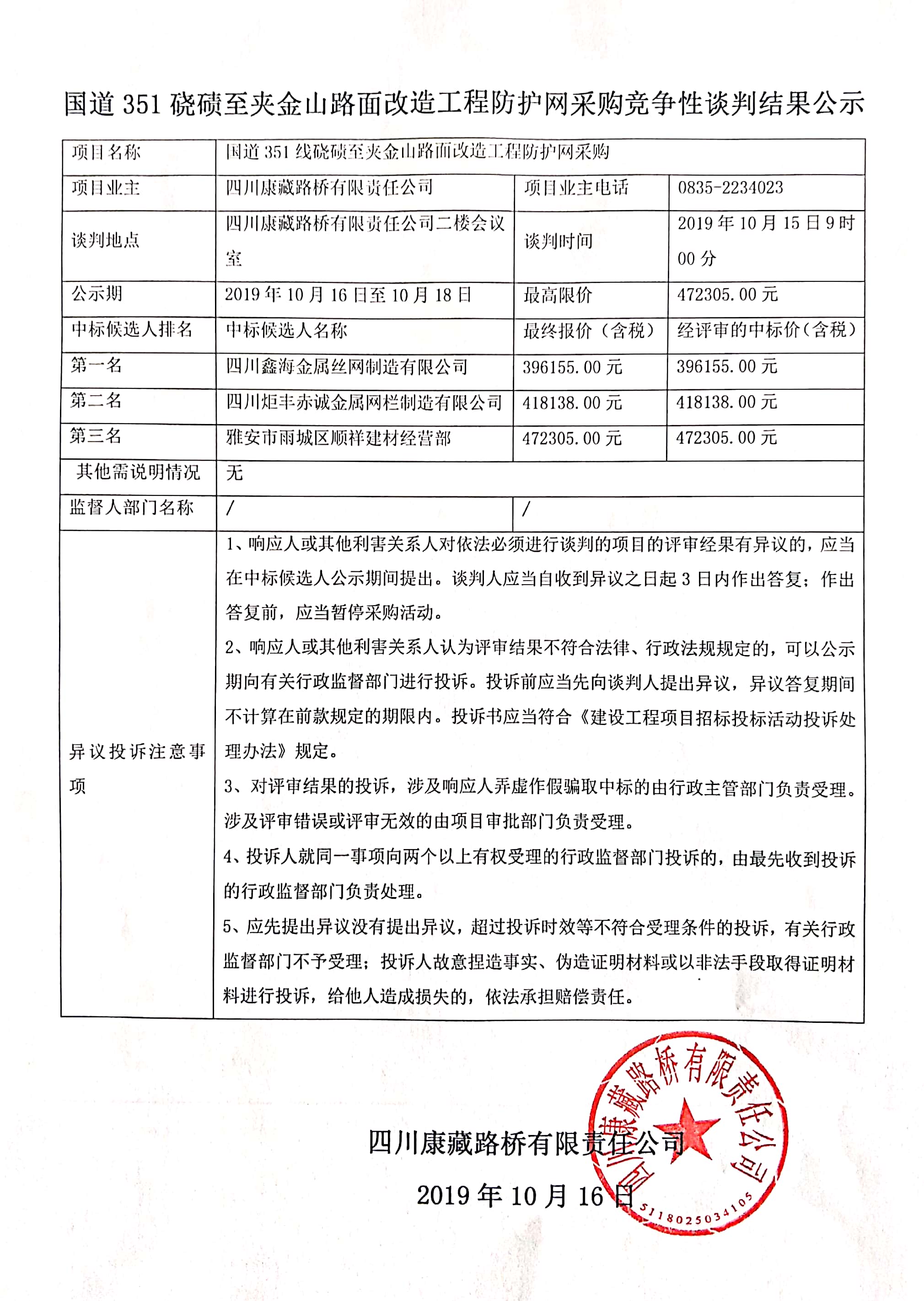 四川康藏路橋有限責任公司國道351磽磧至夾金山路面改造工程防護網(wǎng)采購競爭性談判結果公示