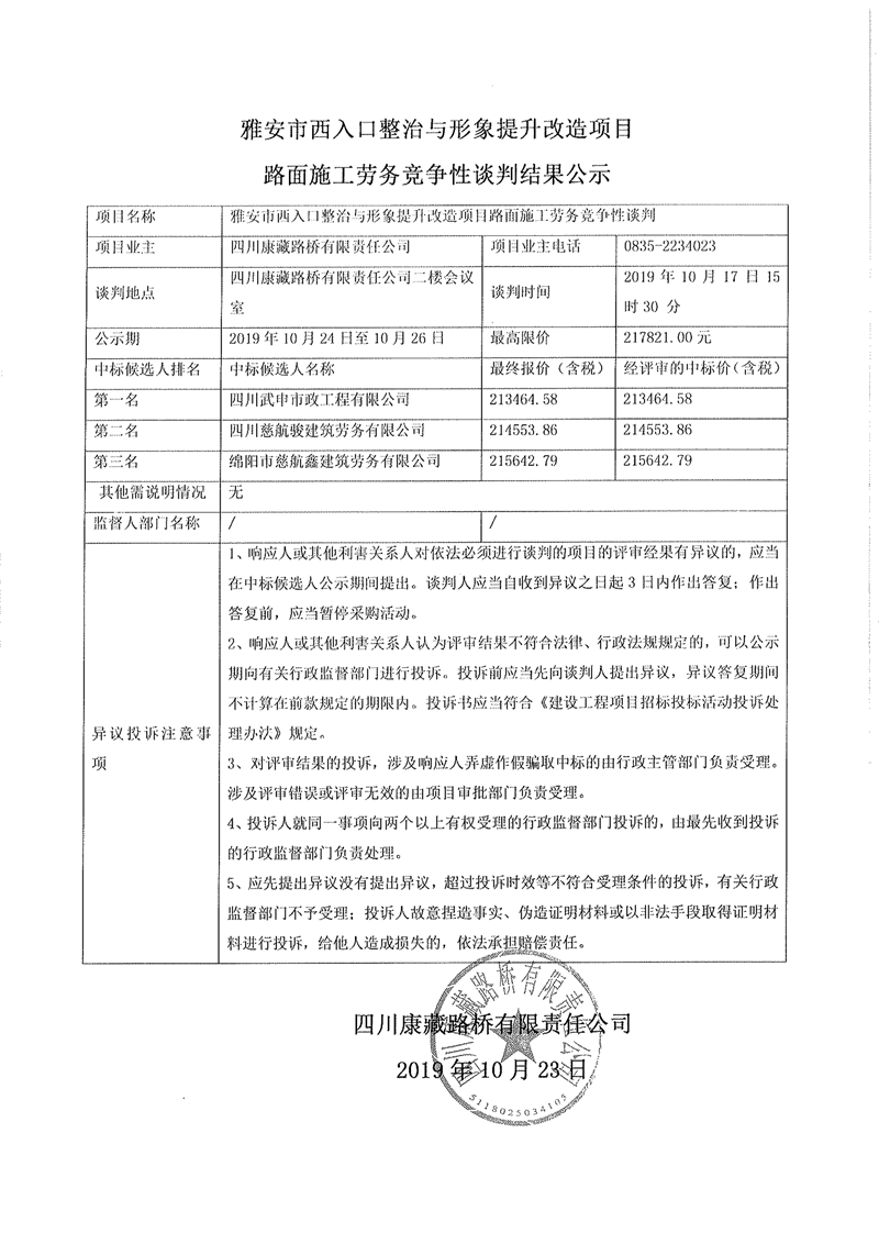 四川康藏路橋有限責任公司雅安市西入口整治與形象提升改造項目路面施工勞務(wù)競爭性談判結(jié)果公示