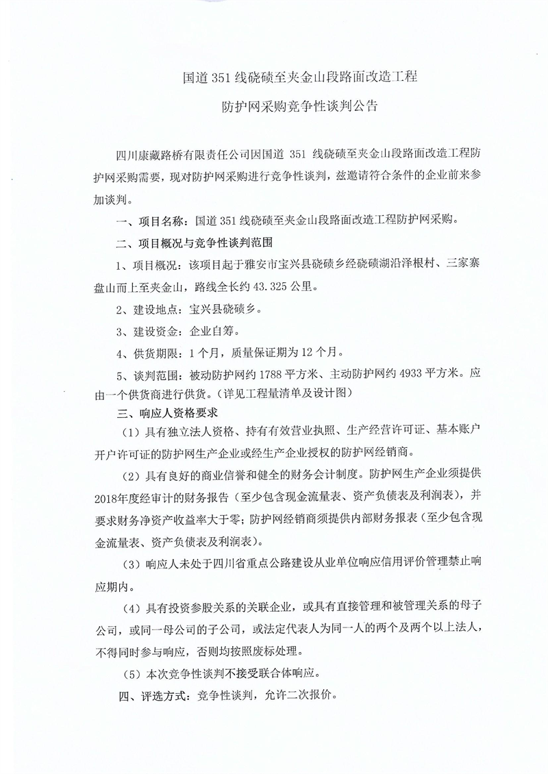 四川康藏路橋有限責(zé)任公司國道351線磽磧至夾金山段路面改造工程防護(hù)網(wǎng)采購競爭性談判公告
