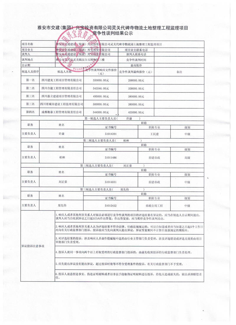 雅安交建集團(tuán)興寶投資有限公司寶興縣靈關(guān)代碑寺物流園土地整理工程監(jiān)理項(xiàng)目競(jìng)爭(zhēng)性談判結(jié)果公示