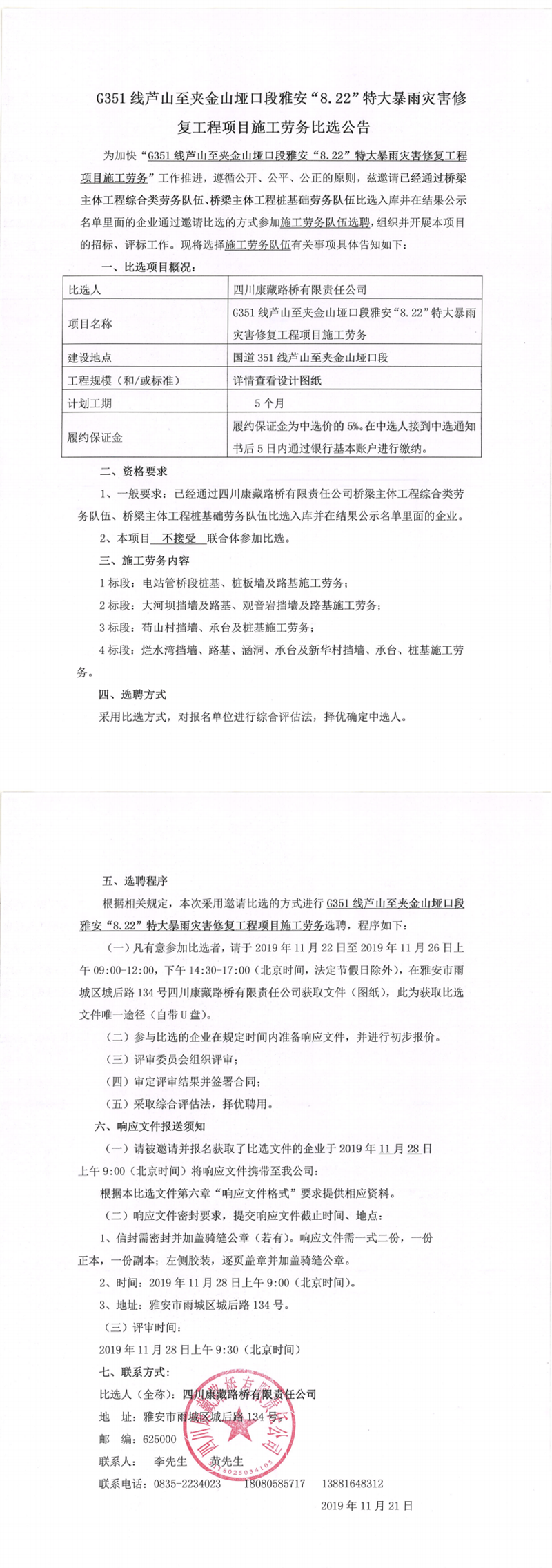 四川康藏路橋有限責任公司G351線蘆山至夾金山埡口段雅安“8.22”特大暴雨災害修復工程項目施工勞務(wù)比選公告