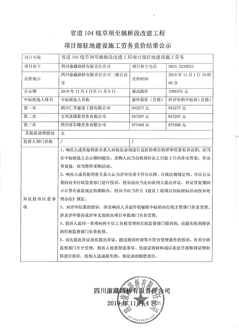 四川康藏路橋有限責(zé)任公司省道104線草壩至姚橋段改建工程項(xiàng)目部駐地建設(shè)施工勞務(wù)競(jìng)價(jià)結(jié)果公示