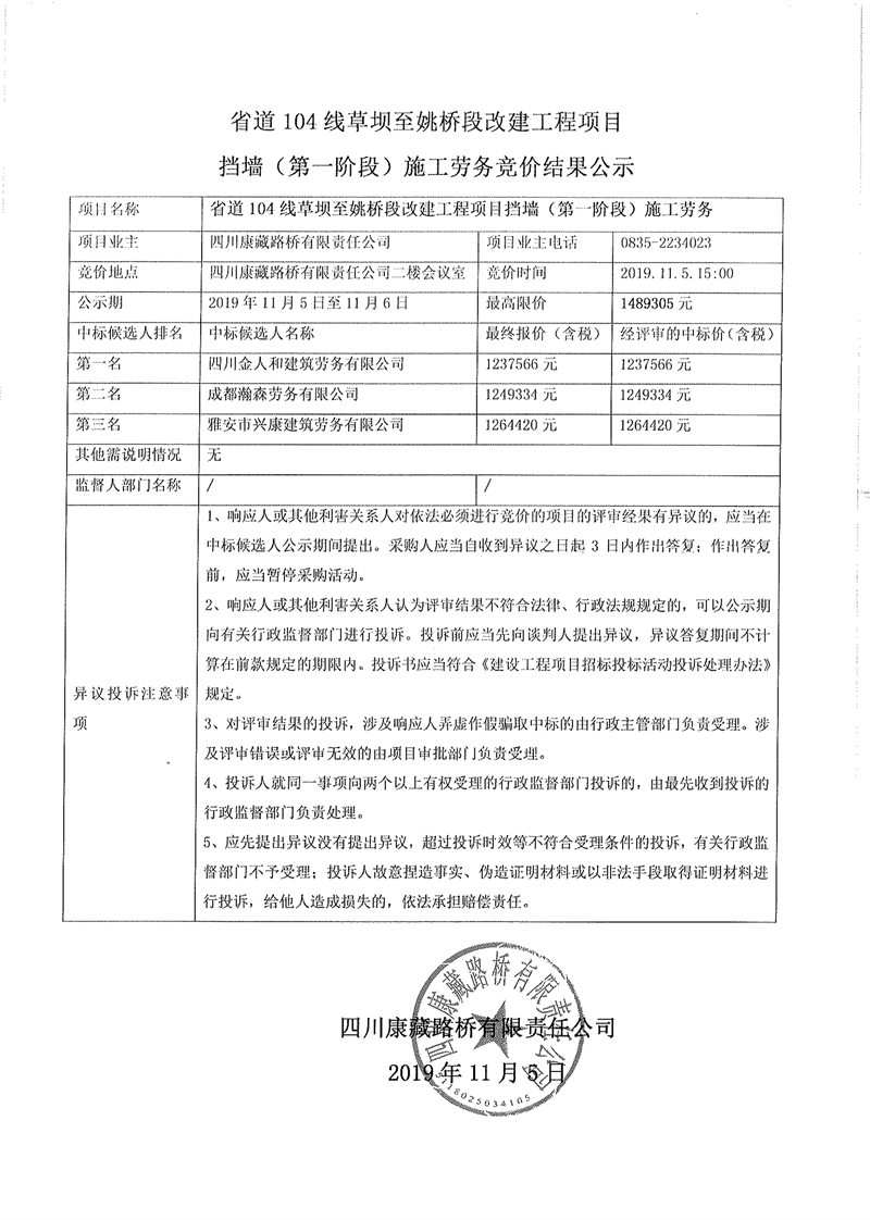 四川康藏路橋有限責(zé)任公司省道104線草壩至姚橋段改建工程項(xiàng)目擋墻(第一階段)施工勞務(wù)競價(jià)結(jié)果公示