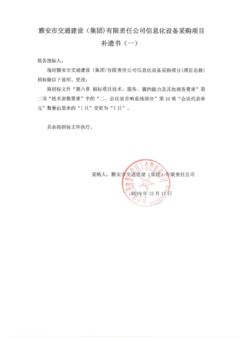 雅安市交通建設(shè)(集團)有限責任公司信息化設(shè)備采購項目補遺書(一)