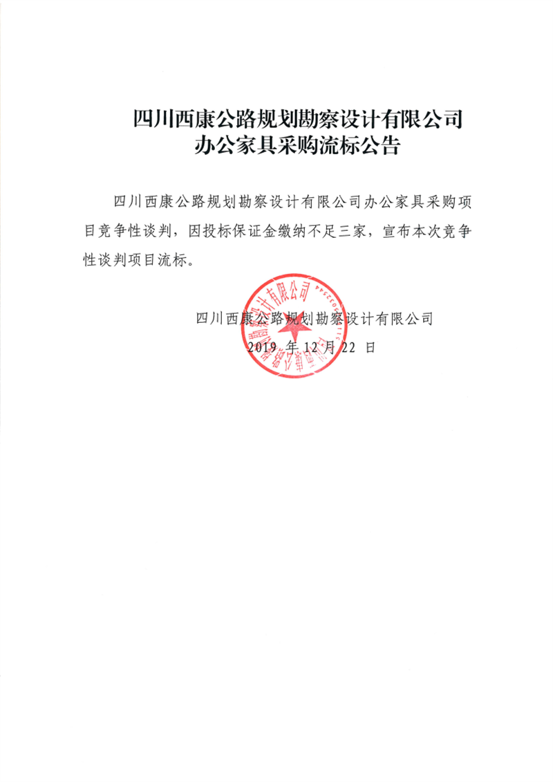 四川西康公路規(guī)劃勘察設(shè)計(jì)有限公司辦公家具采購流標(biāo)公告