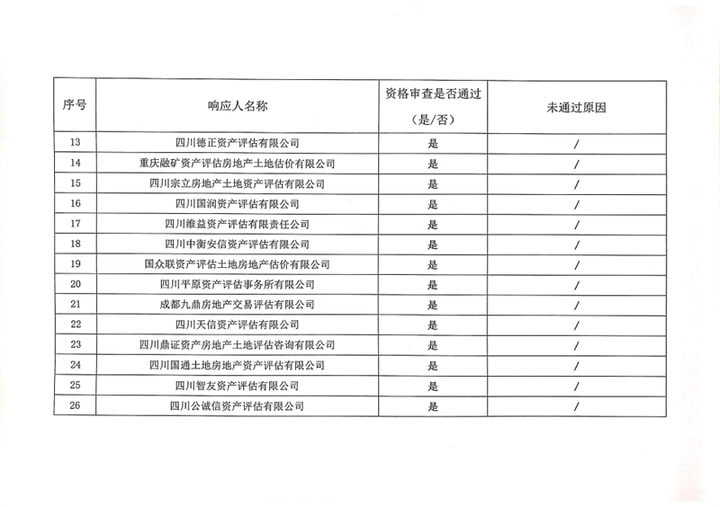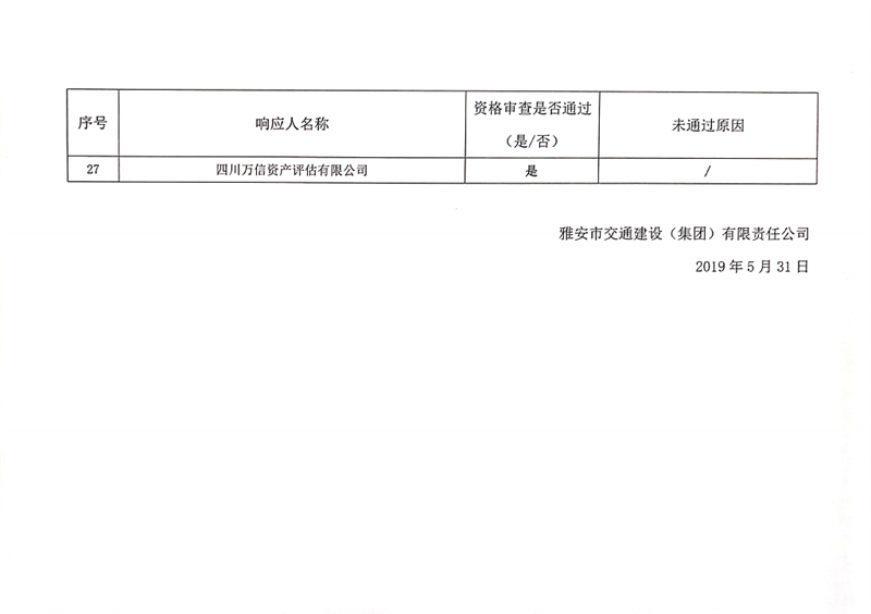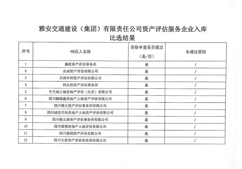 雅安交通建設(集團)有限責任公司資產(chǎn)評估服務企業(yè)入庫比選結果