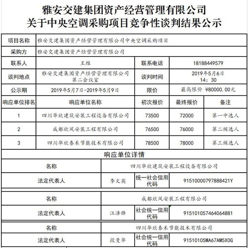 雅安交建集團(tuán)資產(chǎn)經(jīng)營管理有限公司 關(guān)于中央空調(diào)采購項目競爭性談判結(jié)果公示