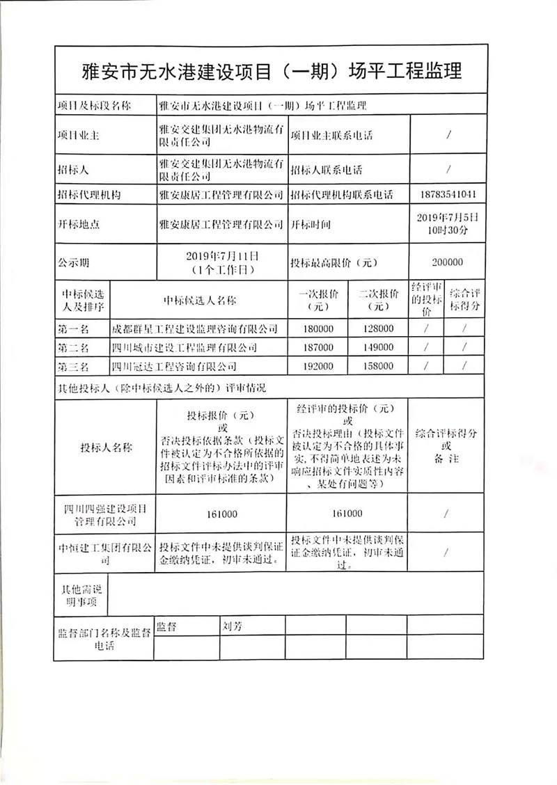 雅安交建集團無水港物流有限責任公司雅安市無水港建設項目(一期)場平工程監(jiān)理競爭性談判結果公示