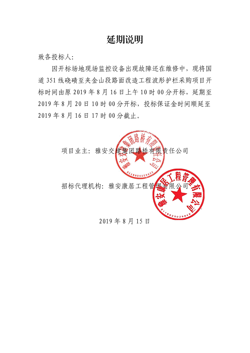 雅安交建集團路橋有限責(zé)任公司國道351線磽磧至夾金山段路面改造工程波形護欄采購延期說明