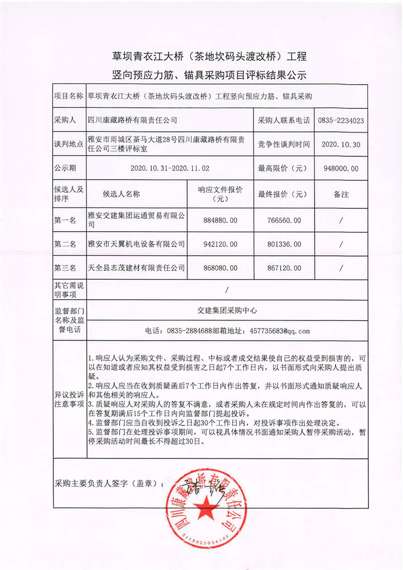 四川康藏路橋有限責任公司草壩青衣江大橋(茶地坎碼頭渡改橋)工程豎向預應力筋、錨具采購項目評標結果公示