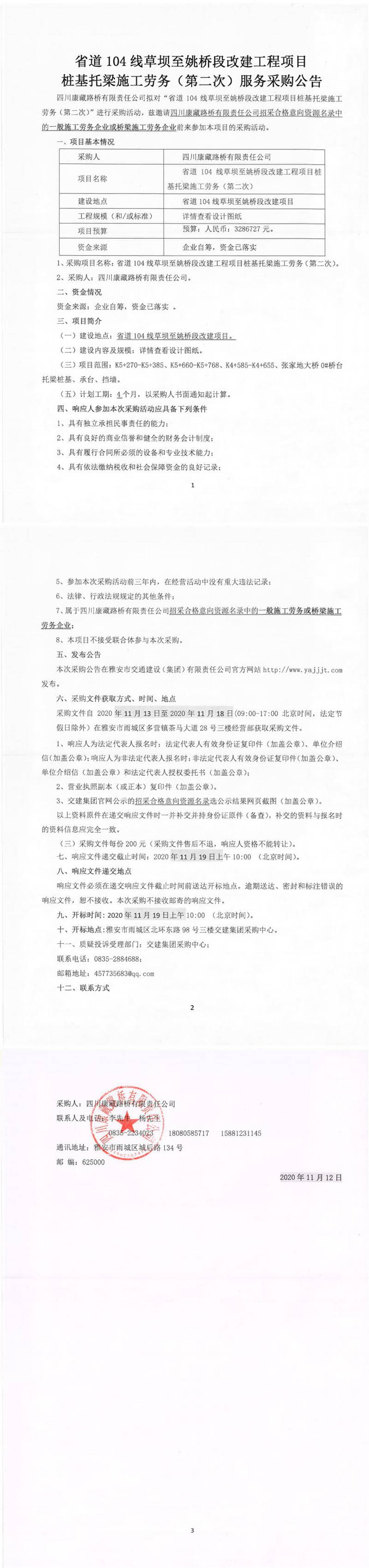 四川康藏路橋有限責任公司省道104線草壩至姚橋段改建工程項目樁基托梁施工勞務(wù)(第二次)服務(wù)采購公告