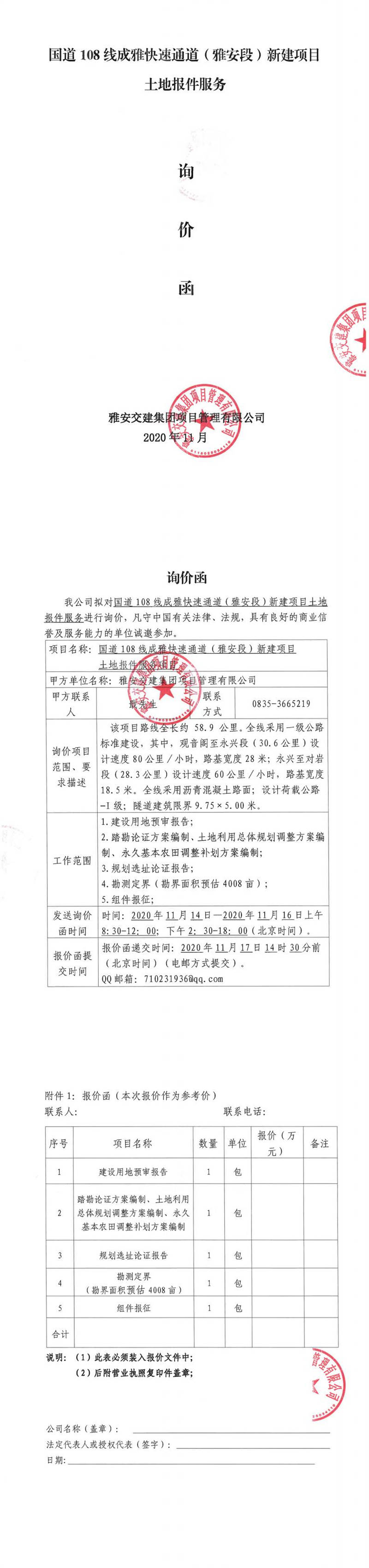 雅安交建集團(tuán)項(xiàng)目管理有限公司國(guó)道108線(xiàn)成雅快速通道(雅安段)新建項(xiàng)目土地報(bào)件服務(wù)項(xiàng)目詢(xún)價(jià)函