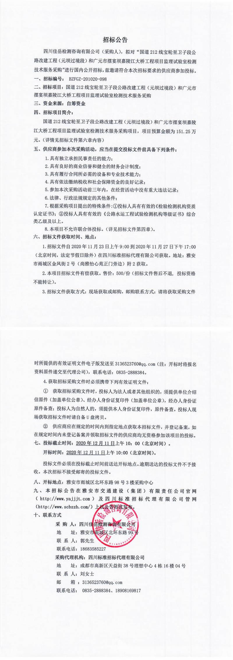 四川佳岳檢測咨詢有限公司國道212線寶輪至衛(wèi)子段公路改建工程(元壩過境段)和廣元市擺宴壩嘉陵江大橋工程項(xiàng)目監(jiān)理試驗(yàn)室檢測技術(shù)服務(wù)采購招標(biāo)公告