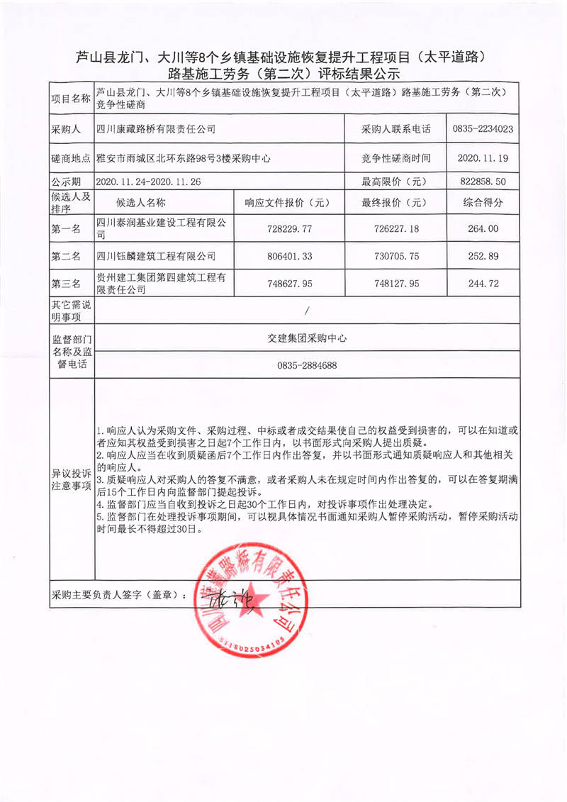 四川康藏路橋有限責(zé)任公司蘆山縣龍門、大川等8個鄉(xiāng)鎮(zhèn)基礎(chǔ)設(shè)施恢復(fù)提升工程項目(太平道路)路基施工勞務(wù)(第二次)評標(biāo)結(jié)果公示