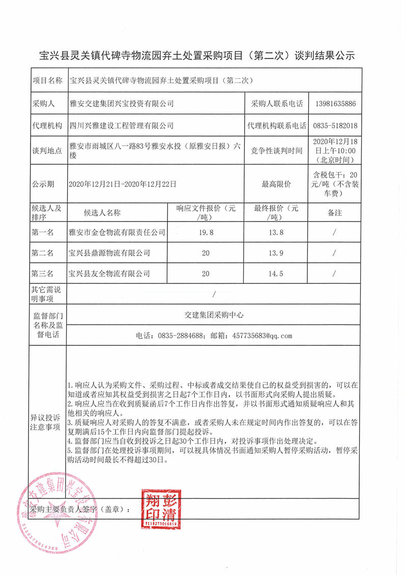 雅安交建集團(tuán)興寶投資有限公司寶興縣靈關(guān)鎮(zhèn)代碑寺物流園棄土處置采購項(xiàng)目(第二次)談判結(jié)果公示