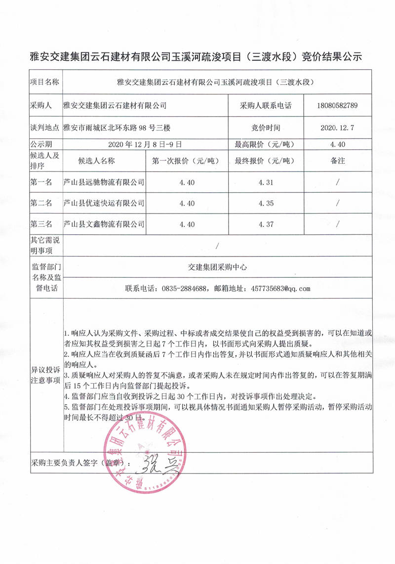 雅安交建集團(tuán)云石建材有限公司玉溪河疏浚項目(三渡水段)競價結(jié)果公示
