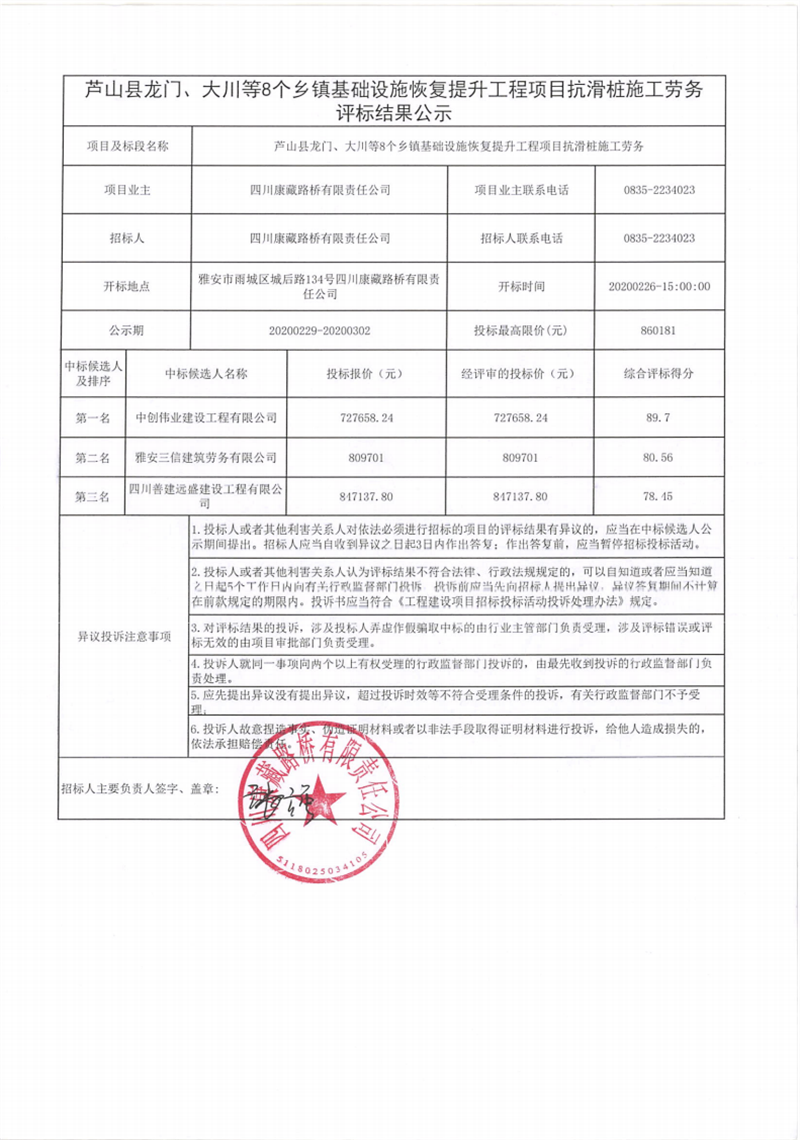 四川康藏路橋有限責任公司蘆山縣龍門、大川等8個鄉(xiāng)鎮(zhèn)基礎設施恢復提升工程項目抗滑樁施工勞務評標結(jié)果公示
