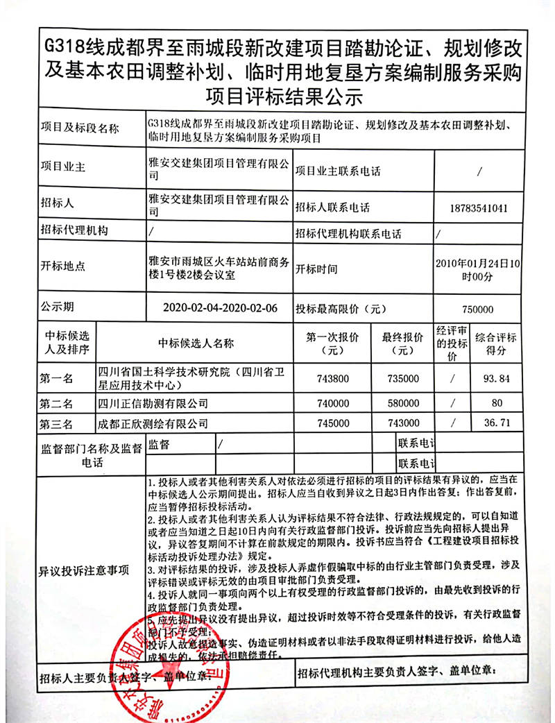 雅安交建集團(tuán)項目管理有限公司G318線成都界至雨城段新改建項目踏勘論證、規(guī)劃修改及基本農(nóng)田調(diào)整補(bǔ)劃、臨時用地復(fù)墾方案編制服務(wù)采購項目評標(biāo)結(jié)果公示