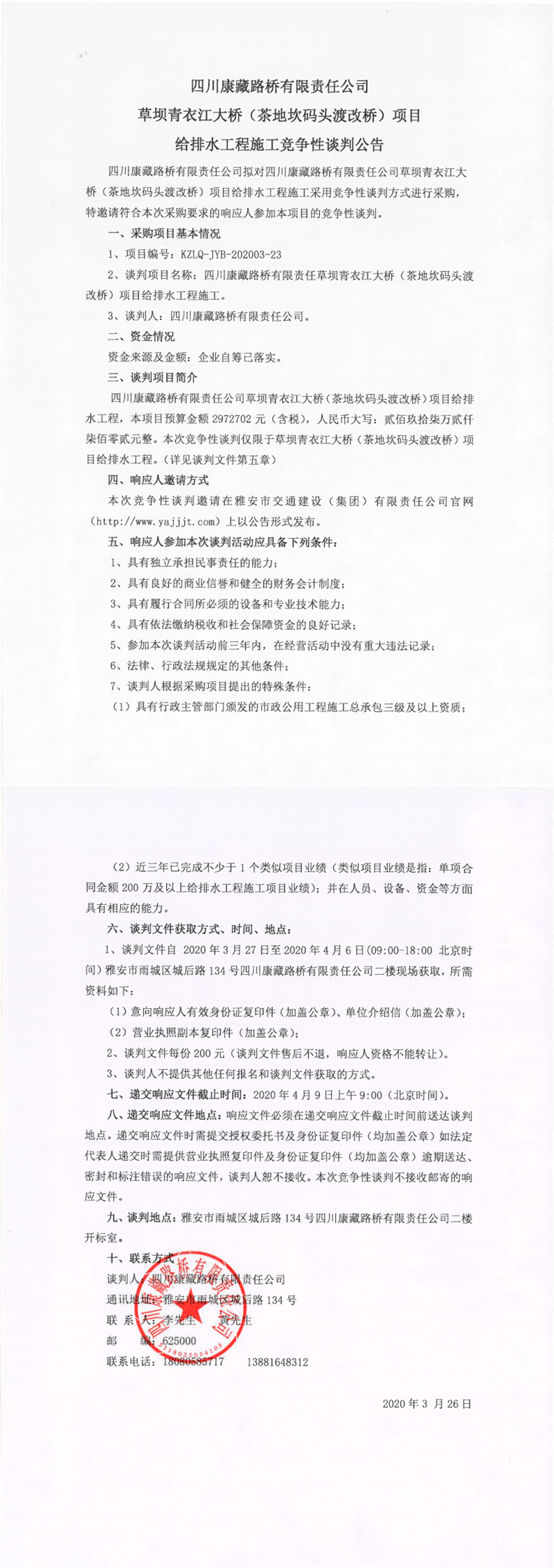 四川康藏路橋有限責(zé)任公司在建項目草壩青衣江大橋(茶地坎碼頭渡改橋)項目給排水工程施工競爭性談判公告