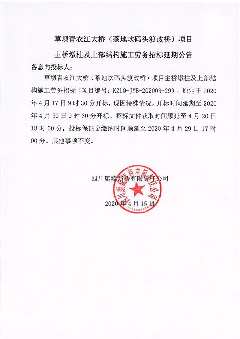 四川康藏路橋有限責(zé)任公司草壩青衣江大橋(茶地坎碼頭渡改橋)項目主橋墩柱及上部結(jié)構(gòu)施工勞務(wù)招標延期公告