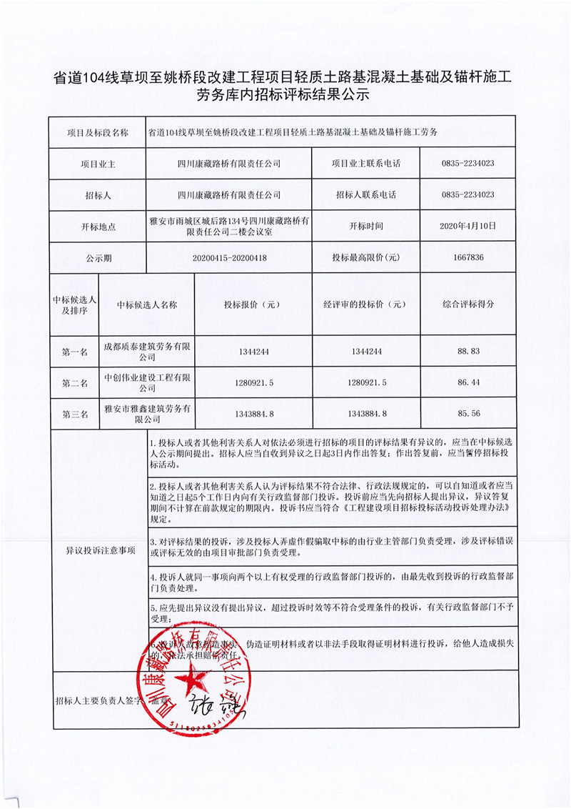 四川康藏路橋有限責(zé)任公司省道104線草壩至姚橋段改建工程項(xiàng)目輕質(zhì)土路基混凝土基礎(chǔ)及錨桿施工勞務(wù)庫內(nèi)招標(biāo)評標(biāo)結(jié)果公示