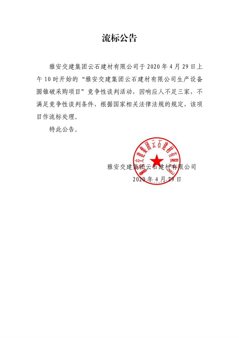 雅安交建集團云石建材有限公司生產(chǎn)設(shè)備圓錐破采購項目流標公告