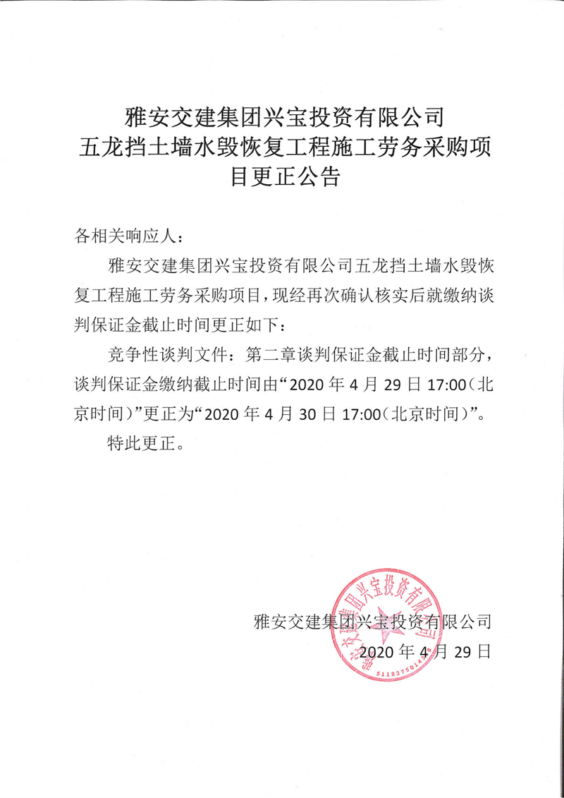 雅安交建集團興寶投資有限公司五龍擋土墻水毀恢復工程施工勞務(wù)采購項目更正公告