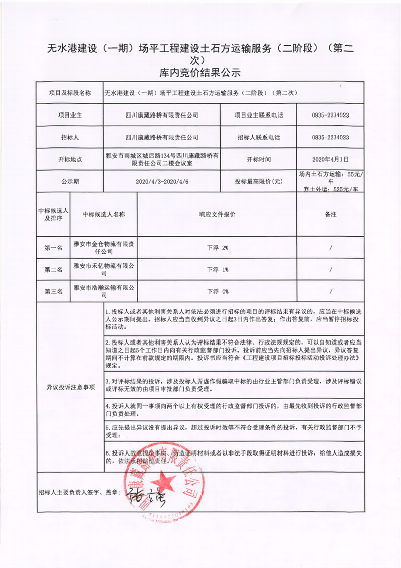 四川康藏路橋有限責(zé)任公司無水港建設(shè)(一期)場(chǎng)平工程土石方運(yùn)輸服務(wù)(二階段)(第二次)庫內(nèi)競價(jià)結(jié)果公示