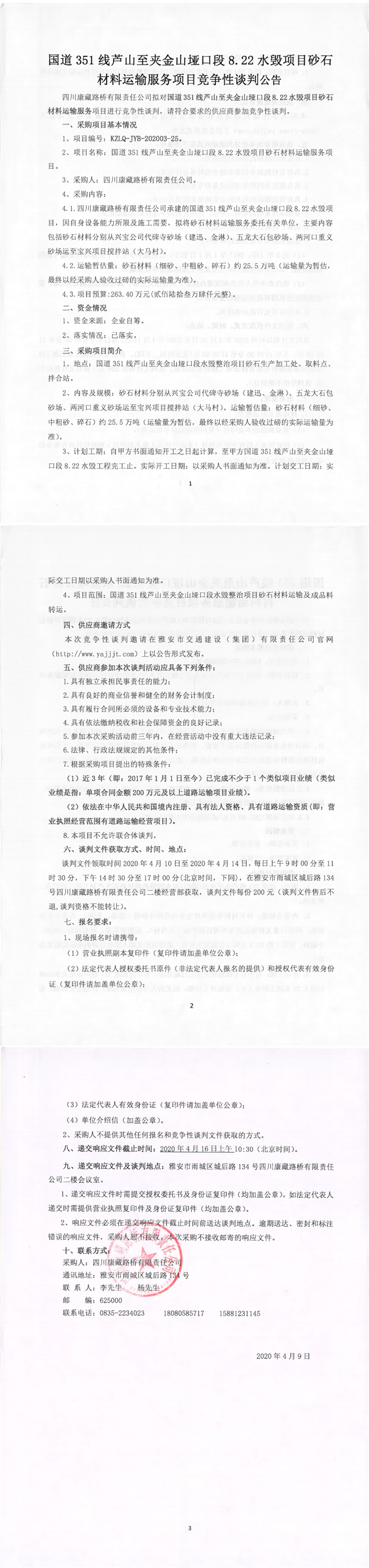 四川康藏路橋有限責任公司國道351線蘆山至夾金山埡口8.22水毀項目砂石材料運輸服務項目競爭性談判公告