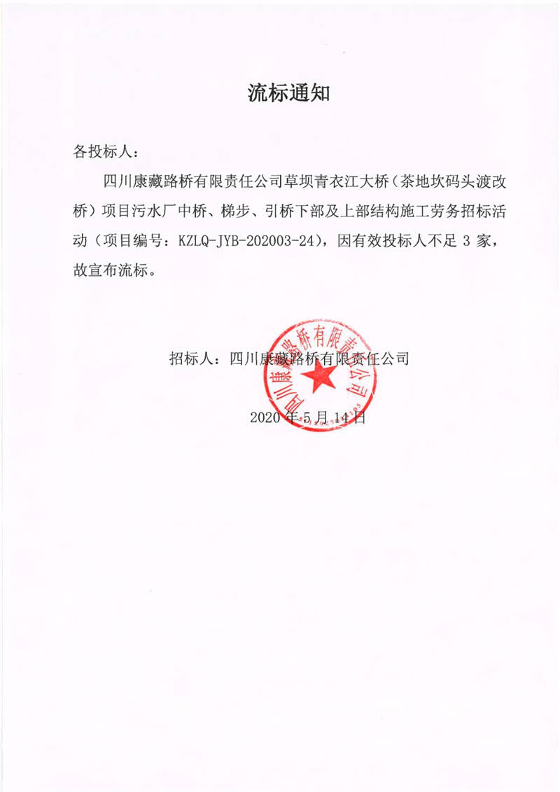 四川康藏路橋有限責(zé)任公司草壩青衣江大橋(茶地坎碼頭渡改橋)項目污水廠中橋、梯步、引橋下部及上部結(jié)構(gòu)施工勞務(wù)流標通知