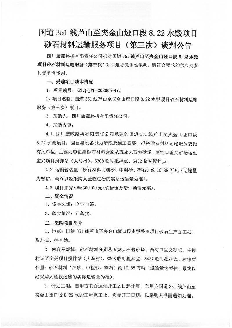 四川康藏路橋有限責(zé)任公司國(guó)道351線蘆山至夾金山埡口段8.22水毀項(xiàng)目砂石材料運(yùn)輸服務(wù)項(xiàng)目(第三次)談判公告