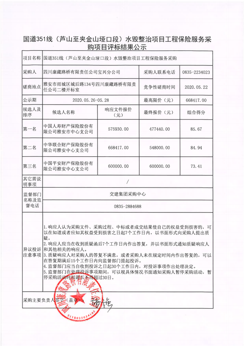 四川康藏路橋有限責任公司寶興分公司國道351線(蘆山至夾金山埡口段)水毀整治項目工程保險服務(wù)采購項目評標結(jié)果公示