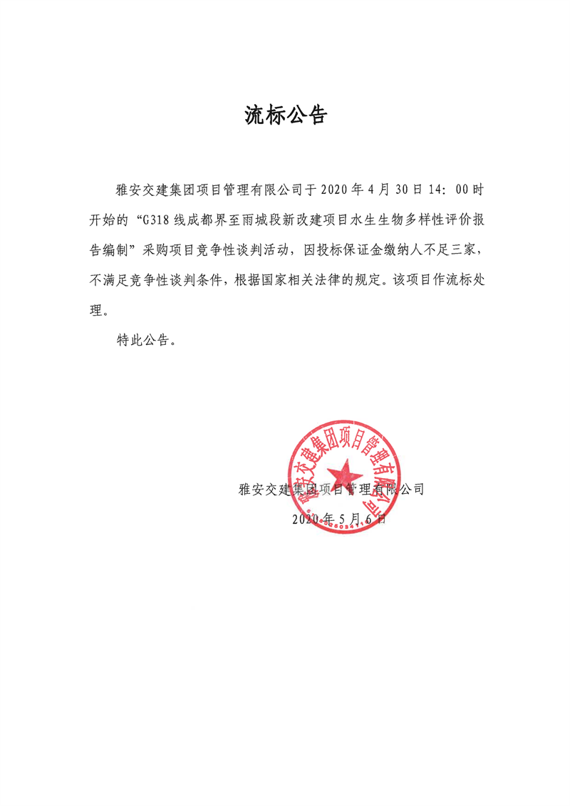 雅安交建集團(tuán)項(xiàng)目管理有限公司G318線成都界至雨城段新改建項(xiàng)目水生生物多樣性評(píng)價(jià)報(bào)告編制流標(biāo)公告