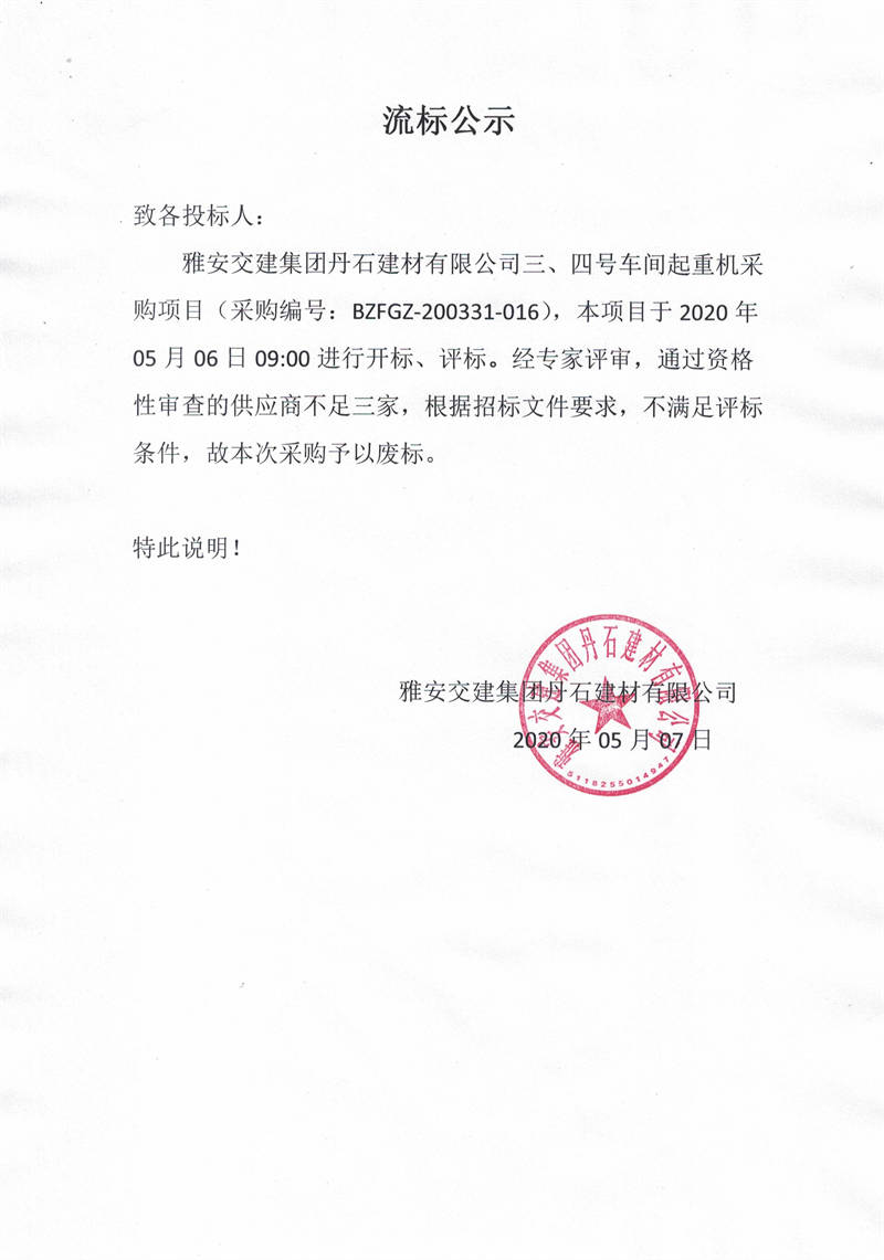 雅安交建集團丹石建材有限公司三、四號車間起重機采購項目流標(biāo)公示