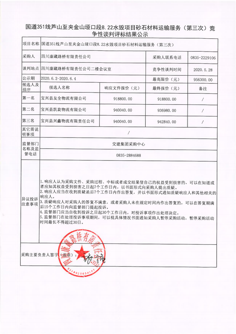 四川康藏路橋有限責任公司國道351線蘆山至夾金山埡口段8.22水毀項目砂石材料運輸服務(第三次)競爭性談判評標結果公示